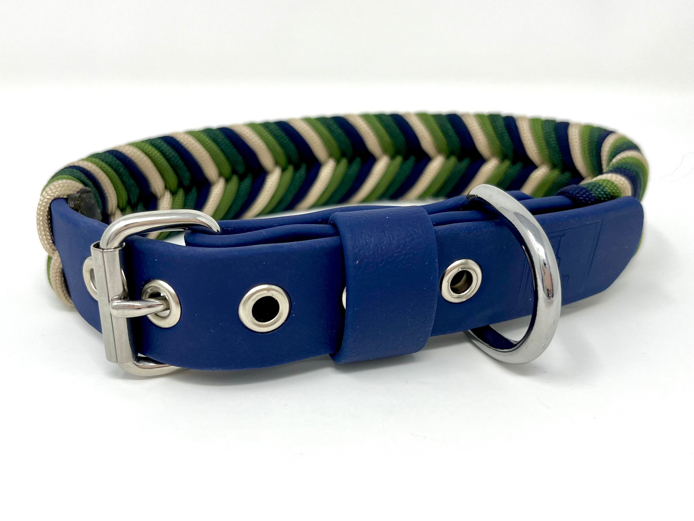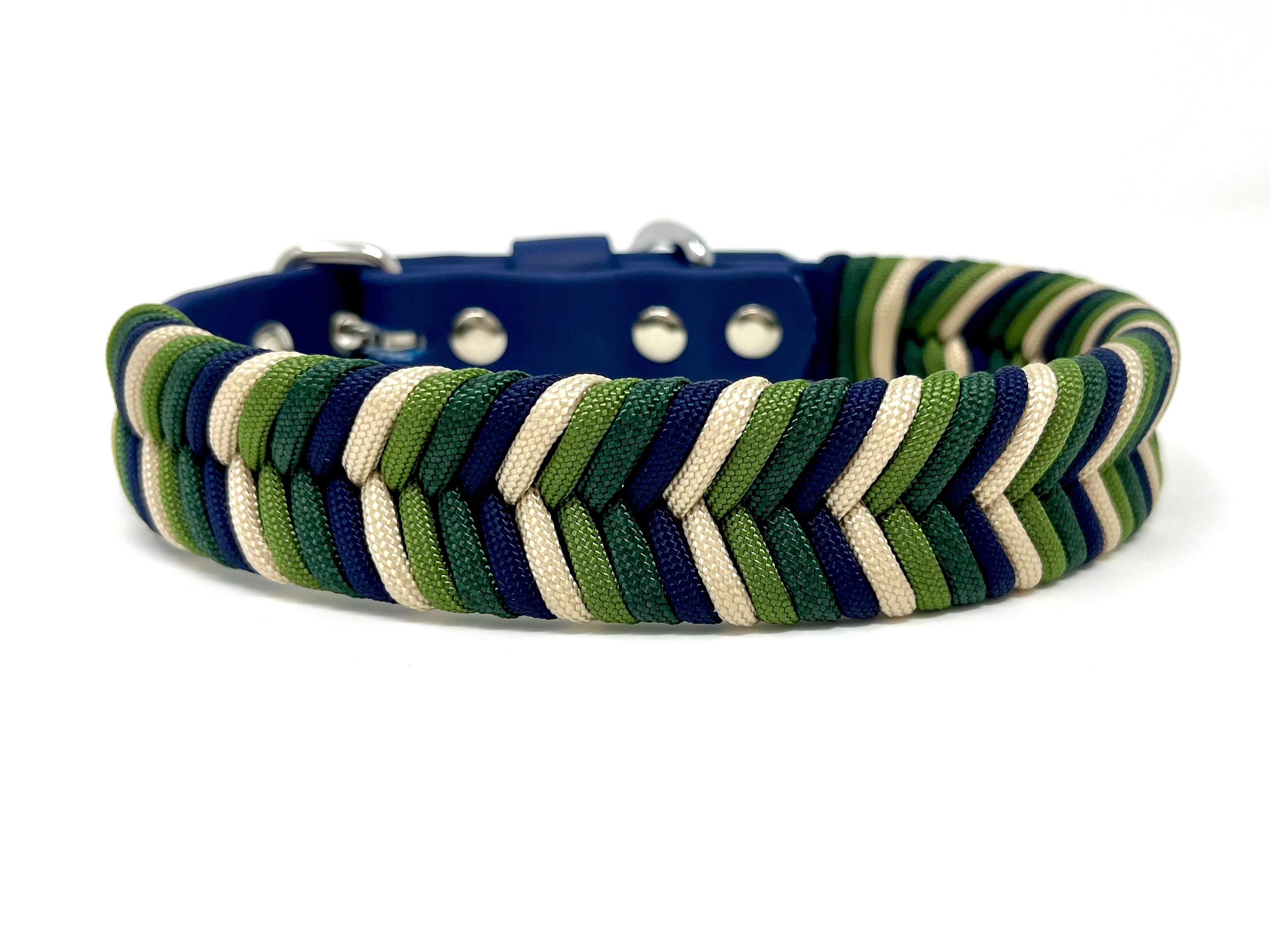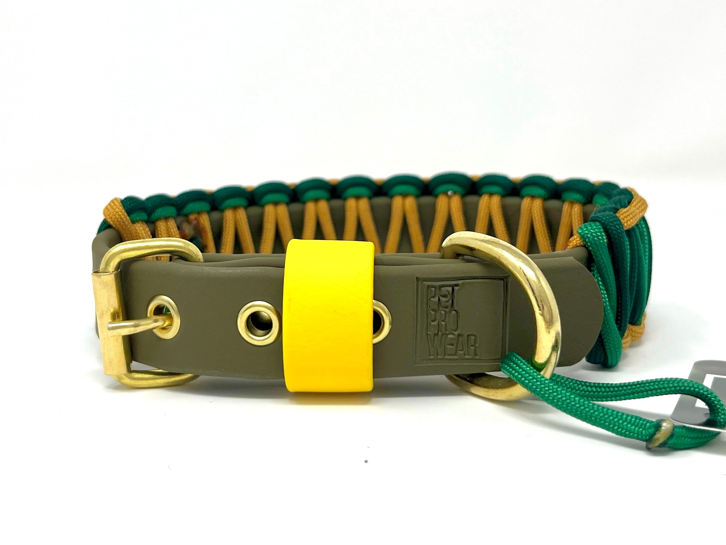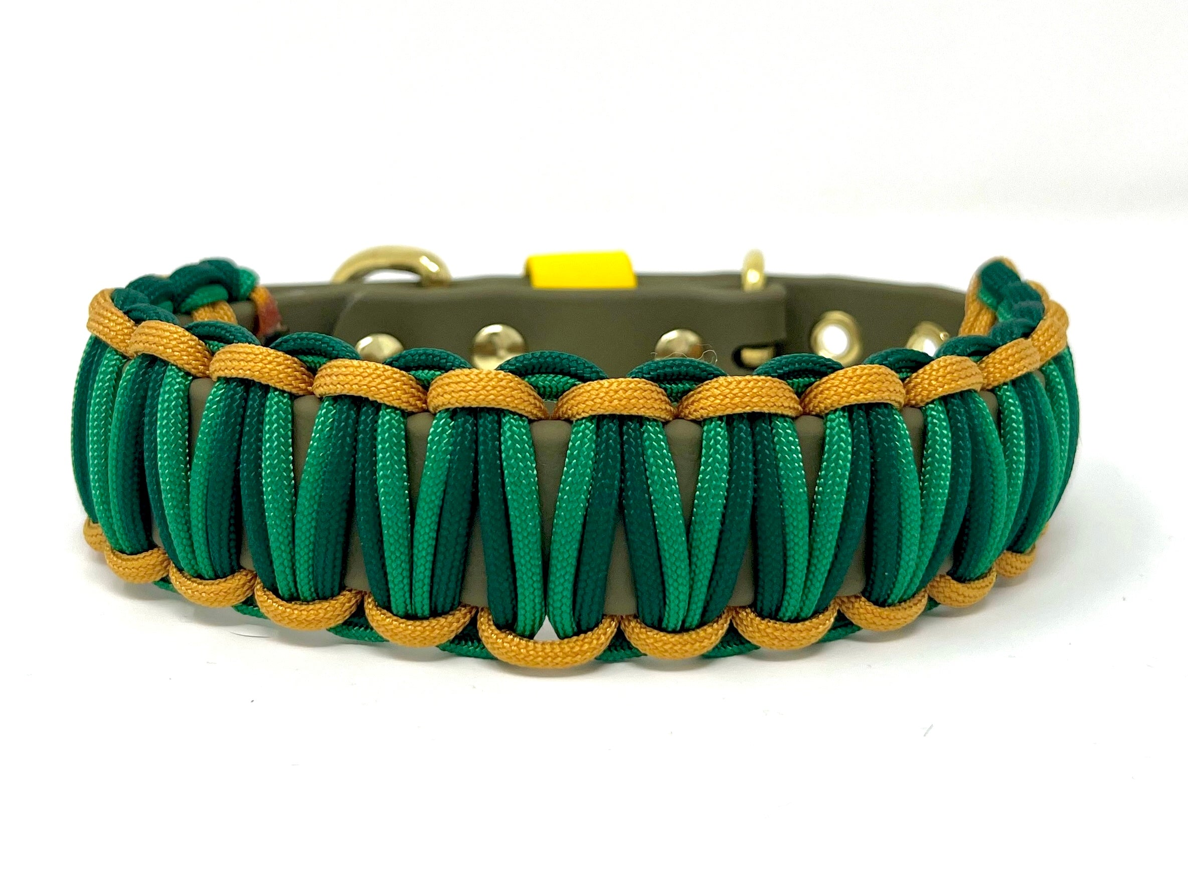 Collier pour chien en Biothane vert kaki, paracorde vert foncé, vert plus pâle et or, quincaillerie or.