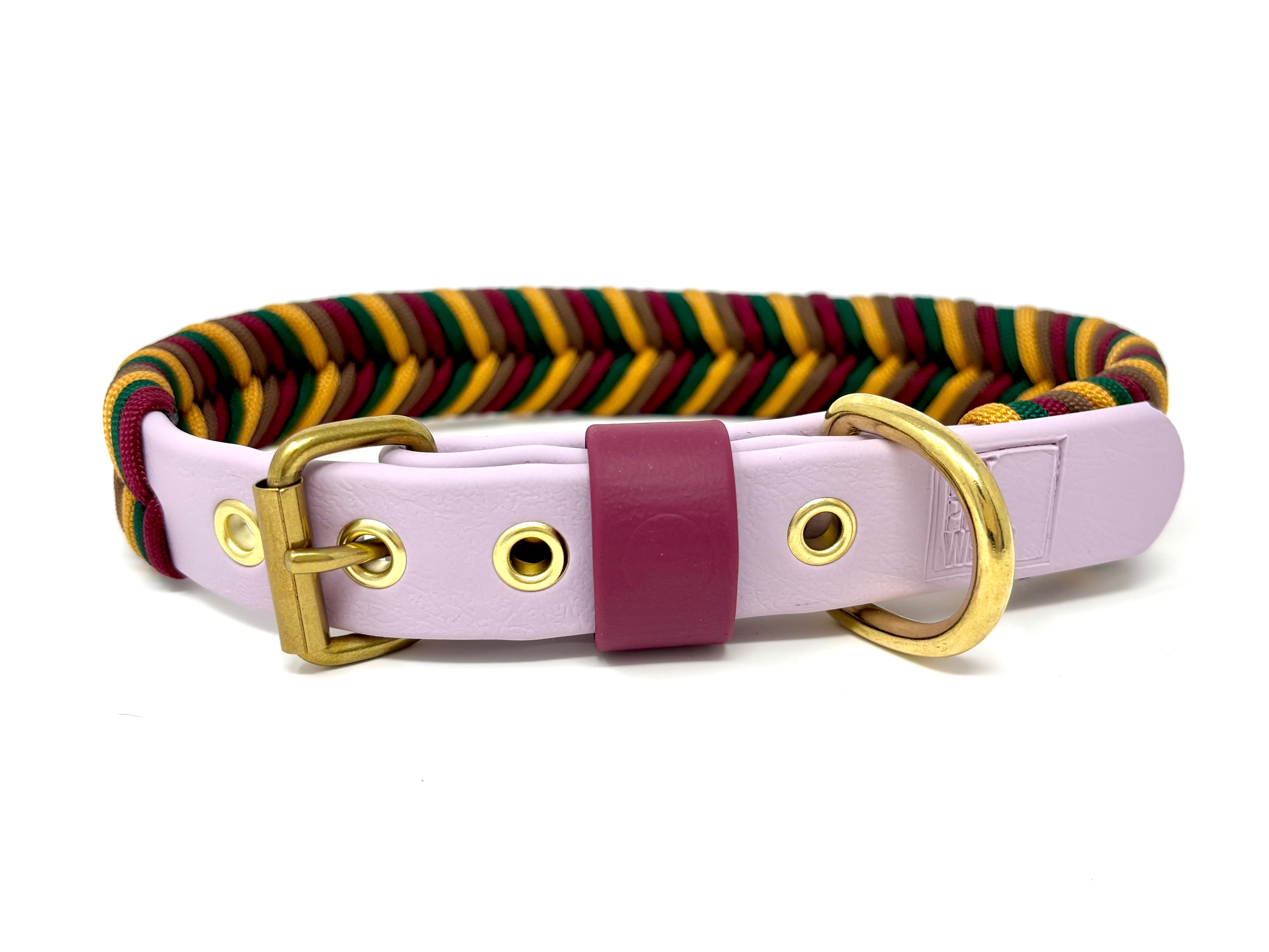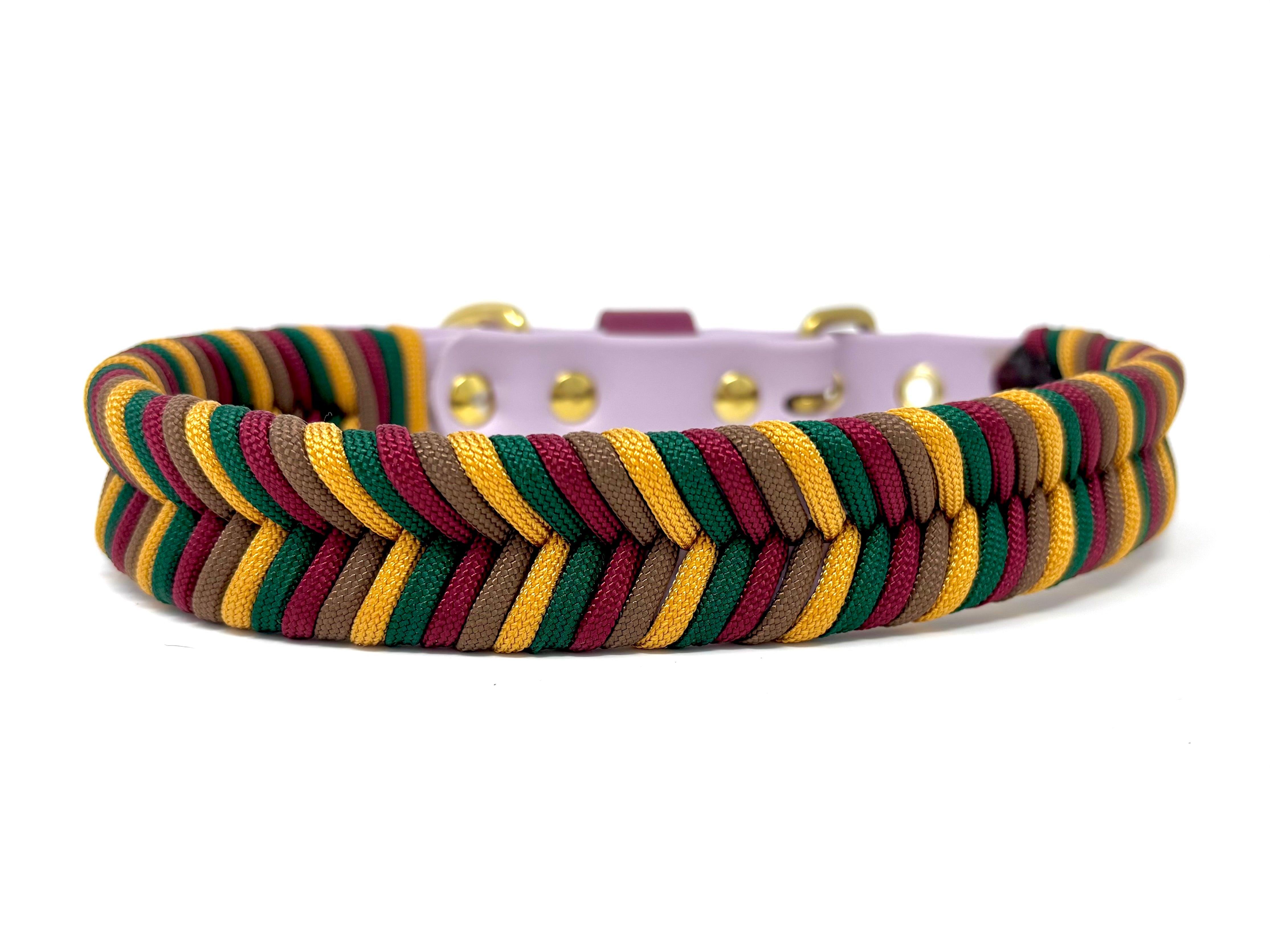 Collier pour chien en Biothane vert, paracorde orange, blanc et brun, quincaillerie or.