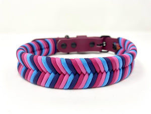 Collier pour chien en Biothane burgundy, paracorde fuchsia, rose, bleu ciel et marine, quincaillerie noire.