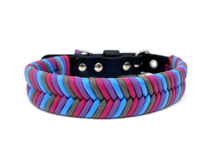 Collier pour chien en Biothane noir, paracorde bleu, rose, gris et lilas, quincaillerie argent.