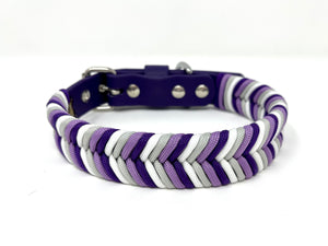 Collier pour chien en Biothane mauve, paracorde mauve, lilas, gris et blanc, quincaillerie argent.