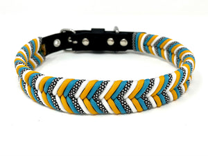 Collier pour chien en Biothane noir, paracorde turquoise, jaune moutarde, diamond et blanc, quincaillerie argent.