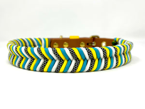 Collier pour chien en Biothane brun pâle, paracorde bleu, jaune flash, blanche et Diamond, quincaillerie or.