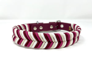 Collier pour chien en Biothane wine, paracorde burgundy, crème, blanc et fushia, quincaillerie argent, ganse blanche.