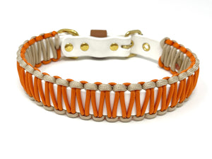 Collier pour chien en Biothane blanc, paracorde orange et beige, quincaillerie or.