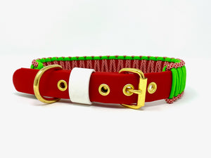 Collier pour chien en Biothane rouge, paracorde verte, diamond rouge, quincaillerie or et ganse blanche.