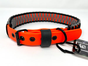 Collier pour chien en Biothane orange, paracorde noire et diamond, quincaillerie noire, ganse noire.