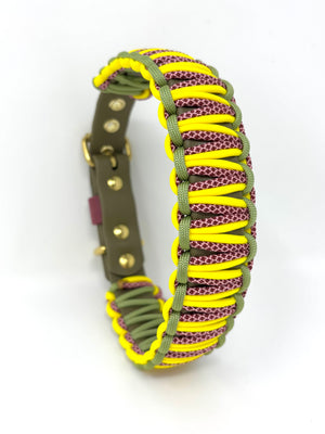 Collier pour chien en Biothane olive, paracorde Diamond wine, jaune flash et vert quacamole, quincaillerie or.
