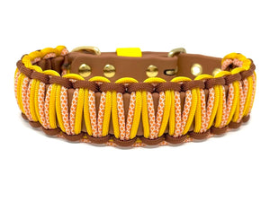 Collier pour chien en Biothane brun pâle, paracorde jaune, brune et diamond orange, quincaillerie or.