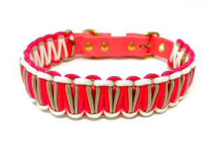 Collier pour chien en Biothane corail, paracorde beige, blanche et rose flash, quincaillerie or.