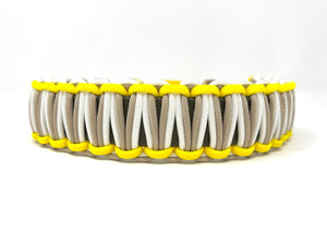 Collier pour chien en Biothane olive, paracorde jaune, blanc et café, ganse jaune, quincaillerie or.