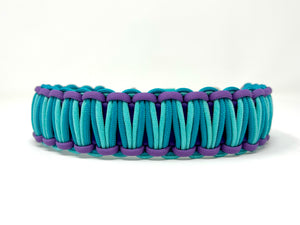 Collier pour chien en Biothane mauve, ganse turquoise, paracordes de couleur turquoise et mauve et quincaillerie argent.