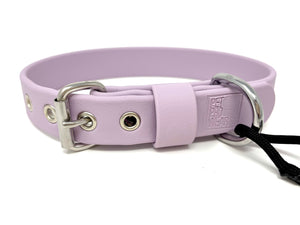 Collier pour chien en Biothane lavande, ganse lavande, quincaillerie argent.