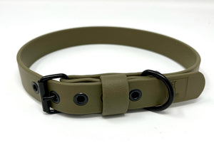 Collier pour chien en Biothane olive, ganse olive, quincaillerie noire.