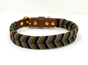 Collier pour chien en Biothane brun foncé, paracorde brun, vert, noir et diamond, quincaillerie argent.