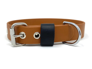 Collier pour chien en Biothane brun pâle, ganse noir, quincaillerie argent.