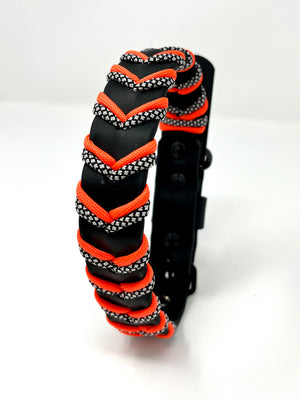 Collier pour chien en Biothane noir, paracorde orange et diamond, quincaillerie noire.