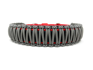 Collier pour chien en Biothane rouge et noir, paracorde gris et diamond, quincaillerie argent.