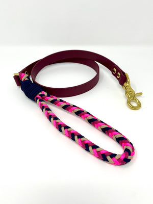 Laisse pour chien en Biothane wine, une poignée tressée avec les mêmes couleurs que le collier arrow Canelle, paracordes marine, moka, rose et fuchsia. La quincaillerie est or.