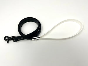 Laisse pour chien faite de Biothane noire et blanche. La quincaillerie est noire.