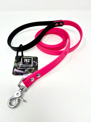 Laisse pour chien faite de Biothane rose. La poignée est en biothane noire. La quincaillerie est argent.