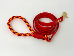 Laisse pour chien en Biothane rouge, une poignée tressée avec les mêmes couleurs que le collier arrow, paracordes jaune, orange, rouge et burgundy. La quincaillerie est or.