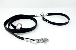 Laisse pour chien en Biothane noir et blanc. La quincaillerie est argent.
