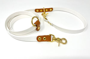 Laisse pour chien en Biothane blanc et brun. La quincaillerie est or.