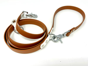 Laisse pour chien en Biothane brun tan et blanc. La quincaillerie est argent.