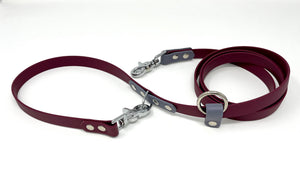Laisse pour chien en Biothane wine et gris. La quincaillerie est argent.