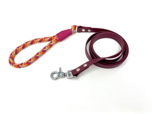 Laisse pour chien en Biothane wine, une poignée tressée avec les mêmes couleurs que le collier arrow ROSE/ORANGE, paracordes orange, fushia, crème et diamond orange. La quincaillerie est argent.