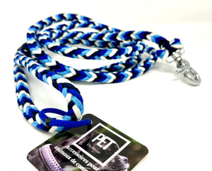 Laisse pour chien tressée, paracordes marine, bleu pale, bleu royale et blanc. La quincaillerie est argent.