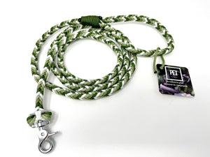 Laisse pour chien tressée, paracordes vert guacamole, vert foncé, diamond guacamole et blanc. La quincaillerie est argent.