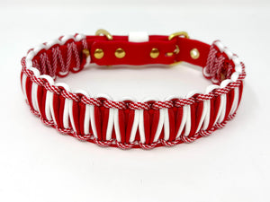 Collier pour chien en Biothane rouge, paracorde candy cane, rouge, blanche, quincaillerie or et la ganse blanche .