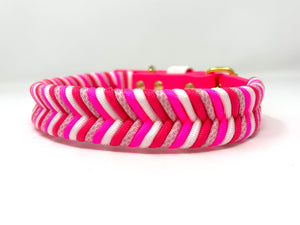 Collier pour chien en Biothane rose, paracorde rose flash, fushia, blanc et diamond rose, quincaillerie or.