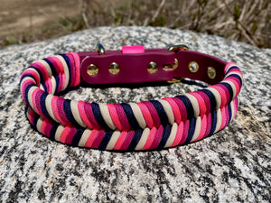 Collier pour chien en Biothane bourgogne, paracorde fushia, rose, marine et crème, quincaillerie or.