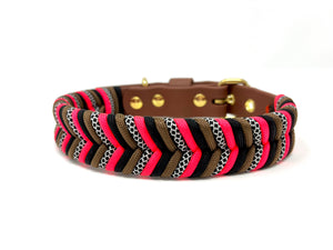 Collier pour chien en Biothane brun foncé 522, paracorde brun, noir, diamond et rose flash, quincaillerie or.