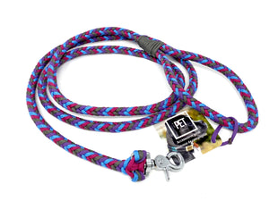 Laisse pour chien tressée avec les mêmes couleurs que le collier Arrow, paracordes bleu,rose,gris et lilas. La quincaillerie est argent.