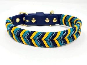 Collier pour chien en Biothane marine, paracorde turquoise, marine, diamond turquoise et jaune moutarde, quincaillerie or.