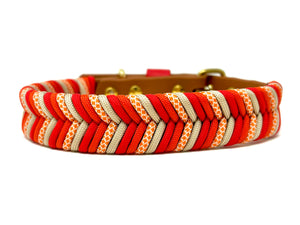Collier pour chien en Biothane brun pâle, paracorde rouge, orange, diamond orange et beige, quincaillerie or.