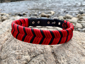 Collier pour chien en Biothane noir, paracorde rouge et noir, quincaillerie argent.