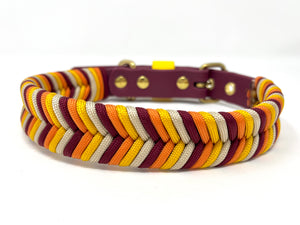 Collier pour chien en Biothane bourgogne, paracorde bourgogne, jaune, orange et crème, quincaillerie or.