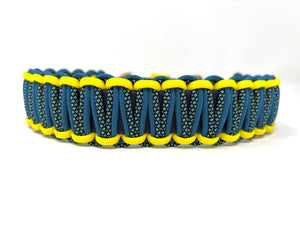 Collier pour chien en Biothane marine, paracorde jaune, turquoise foncé et diamond turquoise, ganse jaune, quincaillerie or.