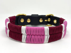 Collier pour chien en Biothane noir, paracorde rose, burgundy et blanc, quincaillerie or.
