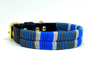 Collier pour chien en Biothane noir, paracorde turquoise, bleu et gris, quincaillerie or.