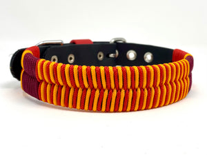 Collier pour chien en Biothane noir, paracorde jaune, rouge et burgundy, quincaillerie argent.