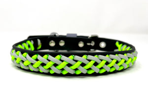 Collier pour chien en Biothane noir, paracorde gris pâle et vert flash, ganse grise et quincaillerie argent.