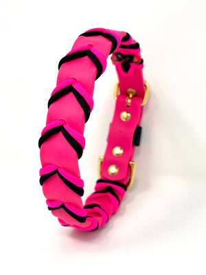 Collier pour chien en Biothane rose, paracorde rose et noir, quincaillerie or.